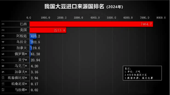 对于美国而言,中国仍然是其大豆种植户的头号目的地市场。美国统计调查局数据显示,2024年美国对华大豆出口价值达128.4亿美元,美国大豆出口总量的将近一半运往中国。若中国完全转向巴西,美国大豆出口可能下降10%~15%。